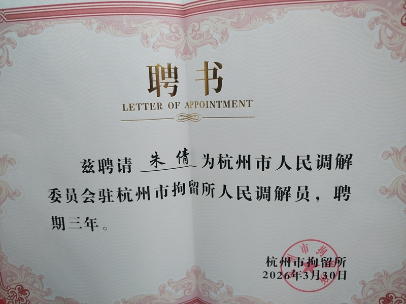作为杭州市拘留所首批派驻人民调解员,朱倩律师将积极投身“拘调衔接”工作实践,立足监管场所矛盾纠纷特点,充分发挥律师专业优势,融合法治教育与矛盾化解,助力从根源上化解因家庭矛盾、经济纠纷、邻里隔阂等引发的违法隐患,推动惩戒处置与源头治理有机统一。